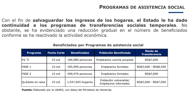 Diese Programme wurden seit April letzten Jahres konzipiert und durchgeführt. Stay at Home, der Employee Solidarity Assistance Fund (FASE) und das Independent Worker Assistance Program (Pa‘ Ti) sollen bis Dezember 2020 laufen, hatte Präsident Luis Abinader berichtet.
